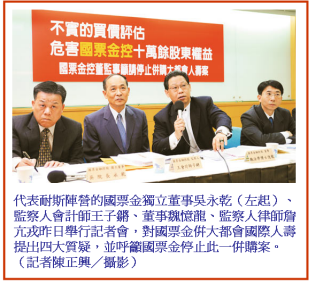 代表耐斯陣營的國票金董事魏憶龍、獨立董事吳永乾,及兩名監察人會計師王子鏘和律師詹亢戎,昨天聯合召開記者會,對國票金併大都會人壽提出四大質疑。