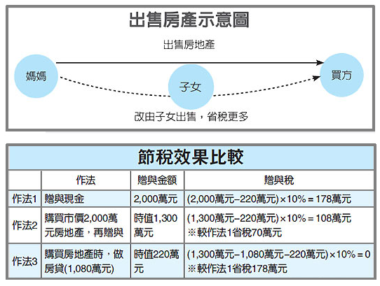 如果子女並無大筆資金,母親也可考慮配合貸款。例如,姜媽媽要購置市價2,000萬元的房子給子女,該房地產的公告現值與房屋評定現值為1,300萬元,則姜媽媽貸款1,080萬元,加上自備款920萬元購置過戶後,再以房子與房貸一同贈與給子女。