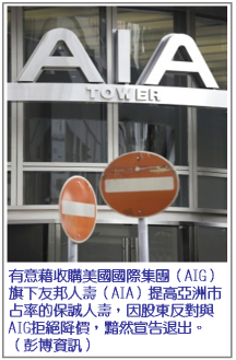 日宣布,由於股東強烈反對加上美國國際集團(AIG)拒絕降價,決定退出收購AIG亞洲子公司友邦人壽(AIA)的計畫,此舉為友邦首次公開發行股票(IPO)鋪路。