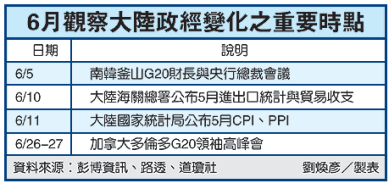 京智庫人士透露,隨著時間進入6月,中國政治踏入傳統的維穩時期,加上先後出現的歐債、罷工與通膨等國內外複雜問題,中共官方宏觀調控的政策方向,預期6月將以維穩為主調,推出重大財經政策的可能性低。