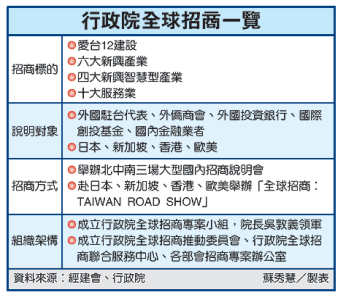 行政院全球招商時程敲定,7月25日首發日本團出發,10月起更將赴海外辦大型招商說明會。