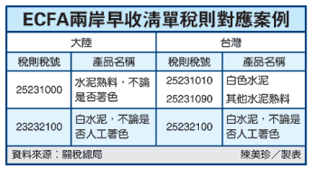 關稅總局說,台灣出口白色水泥或其他水泥熟料在台灣適用二種不同稅號,但到大陸海關依據兩岸早收清單時,即會歸為同一稅號(即25231000),均能享有關稅調降利益。