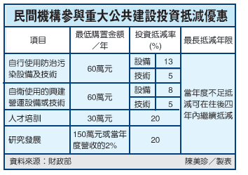 財政部重新修訂民間機構參與重大公共建設適用投資抵減辦法,提供民間參與重大公共建設如機場、捷運、下水道等公共工程BOT案的投資抵減率雖未調整,但卻解除參與重大公共工程投資商申請減稅的限制,未來參與政府BOT案的民間機構,將可視公共工程的性質與投入時間,充分享有政府的租稅獎勵優惠。行政院已經核定民間機構參與重大公共建設適用投資抵減辦法修正案,並自即日起正式實施。