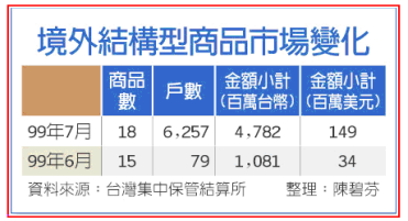果然,7月間上架零售市場的3檔結構型商品,在與國壽、富邦人壽等壽險通路合作下,市場很快就「燒」起來,非專業投資人的驚人購買力使得7月間結構型商品的戶數爆到6,257戶,較前月增加80倍。