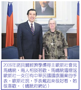 2009年諾貝爾經濟學獎得主歐斯壯(Elinor Ostrom)昨(23)日與馬英九總統在多項環保議題擦出火花。不論是這位經濟學大師的「多重中心」學說與屋頂綠化減碳,或馬總統在台北市長任內推動的垃圾費隨袋徵收及白色屋頂降低耗能,雙方都有高度交集。歐斯壯今(24)日將出席本報2010大師論壇,並發表兩場專題演講,講題分別是「氣候變遷與全球治理」及「地下水資源治理」。歐斯壯昨天會見馬總統。歐斯壯去年赴瑞典領獎前,曾在白宮短暫會晤美國總統歐巴馬。歐斯壯昨天表示,她感覺馬總統是位明快且富智慧的領導者,給她的印象遠較多數人深刻。