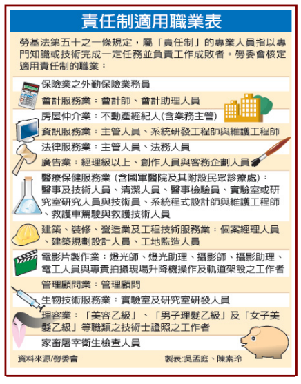 勞委會表示,責任制來自勞基法第84條之1,也就是排除正常工時適用的對象,其中分為監督管理人員、責任制人員及監視、間歇性工作者。自85年以來只核定39種職務適用84條之1,其中有些是「責任制專業人員」,有些則是「間歇性工作」與「責任制專業人員」兼具,因此可以泛稱為責任制約只有10餘項。