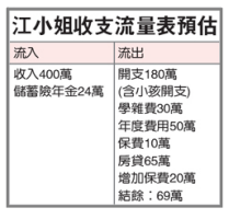 一、江小姐並無一般受雇或自營固定工作,但人脈極廣,除有豐厚佣金收入,另外一半為理財收入,想審視目前投資理財方式的風險,並希望以退而不休狀態至60歲,過了60歲後完全退休,並想在宜蘭享受自然生活,屆時台北住房可能出售換購,生活費預估可以減少一些。