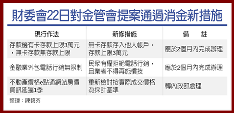 消費金融許多執行問題,成為立委接受民眾陳情的重點。財委會22日中,立委們提出多件要求金管會修改的措施或作法,包括存款機無卡存款存入他人帳戶限制在3萬元上限,金融業外包電話行銷產品,民眾有權拒絕電話行銷,且業者不得再施慣技等,金管會將於2個月內完成辦理,避免民眾權益損失。