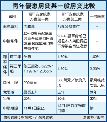 內政部版的青年安心成家方案,也就是所謂的第一案,今年第二次公告受理申請期間,已在11月1日結束。與財政部推的新案相較,內政部方案因為有政府補貼利息,資格限定較嚴,利率更優惠、相對的額度也較低,財政部版資格寬鬆許多,且若房貸金額較大,還可在500萬元優惠房貸額度外,搭配一般房貸,只要總計核貸成數不超過八成即可。