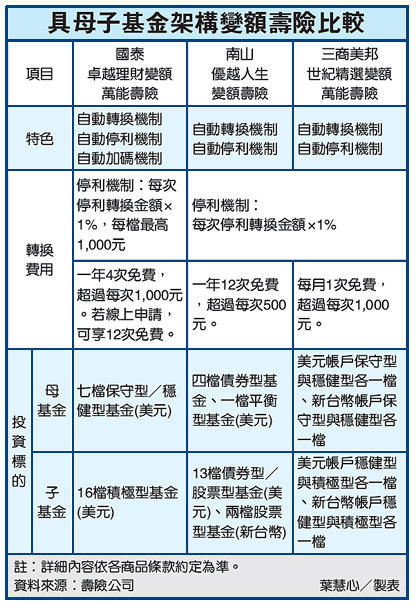 國泰人壽投資型商品開發團隊昨(2)日率先宣布,推出具定期不定額加停利機制的「卓越理財變額萬能壽險」。不但有「母子基金」間的每月自動轉換機制及子基金的每日停利機制外,更首創子基金超跌時的加碼機制。