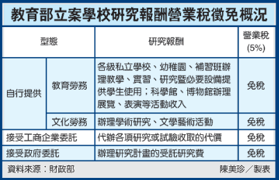 財政部指出,學校提供的教育及文化勞務,不論是接受工商企業或政府委託,回歸營業稅法課徵後,基於財政部早在民國75年及99年已分別發布行政命令規定可享免稅,因此學校機構教育文化勞務收入,仍能續享免稅。