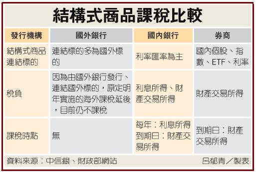 由於發行機構與連結標的都各分為國內外業者,銀行主管指出,簡單區分原則是,國外不用課稅,國內要課稅。
