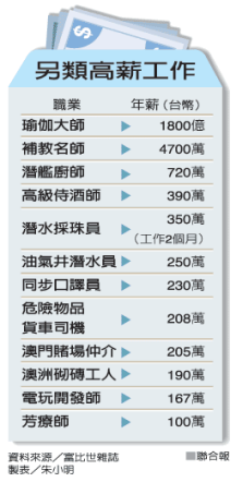 美國財經雜誌「富比世」報導亞洲12種另類高薪工作,台灣的芳療師以年收入逾3.1萬美元(約台幣100萬)名列其中,其他入選的包括瑜伽和補教名師。