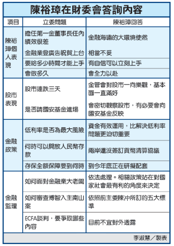 陳裕璋昨天首度赴立法院財委會備詢,是他在立法院的處女秀。立委詢問,前主委陳冲指出,低利率是目前最大市場風險,陳裕璋是否也有同感?