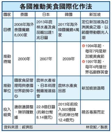這幾年,包括日韓泰都積極藉由美食輸出文化,未來幾年內,經濟部不只要協助台灣美食「在地國際化」,也要協助業者做到「國際當地化」。