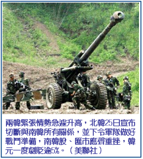 南韓聯合通訊社廿五日發布北韓領導人金正日已下令軍隊和民防組織備戰的消息,南韓股匯市立刻出現恐慌性賣壓,台灣和其他亞洲股市也全倒。後來進一步消息指出,金正日是在本月廿日下令備戰,並非最新命令,而且是在北韓遭到攻擊後才會反擊,但因北韓又揚言,南韓海軍船艦若繼續越界,北韓將採取軍事行動,市場仍惶惶不安。