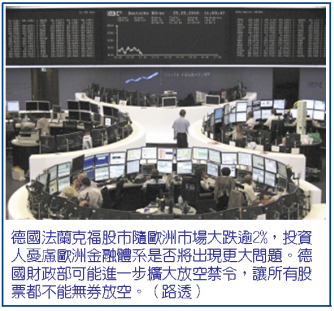 在此之前,德國上周意外單方宣布十大金融類股以及歐元債券禁止無券放空,一度驚嚇市場。投資人憂慮各國政府將自行其是,造成市場更多的不確定性。
