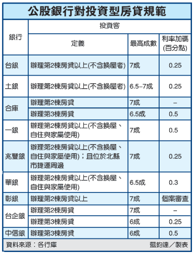 比方,華銀規定,第二棟以上歸於投資客,銀行將調高適用利率0.3個百分點,最高核貸金額也降至六成五,比一般貸款人可申請八成、八五成的核貸金額,條件嚴苛許多。但民營業者有些甚至要第三棟才算,客戶自然流到民營業者,在這樣的限制之下,公營行庫可能失去部分有貢獻度客戶。