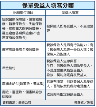 民眾買保單時往往會注意保費和保額多少,卻不太重視受益人填寫的重要性,等到發生事故才發現當初受益人的填寫方式,影響很大。壽險業提醒,買保險除應確保保障足夠,也要注意受益人填寫,可視家庭組成分四大族群安排受益人名單。