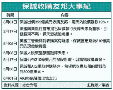 保誠最初提議用355億美元收購友邦,後來又把出價降到304億美元,以平息股東怒火,但遭AIG拒絕。保誠估計,收購友邦失敗已讓公司損失4.5億英鎊(6.59億美元)。