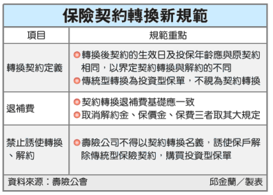 為維護保戶權益,金管會要求壽險公會修訂保險契約轉換自律規範,以後保險公司不得再以契約轉換的名義,誘使保戶將傳統型保單解約,轉為購買投資型保單;此外,同一類型契約轉換的退補費計算基礎必須一致。