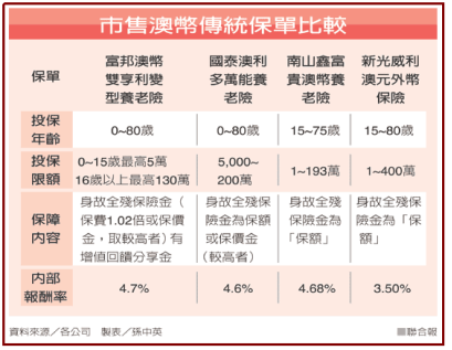 外幣利率變動型壽險或萬能壽險注重宣告利率,目前新台幣利變或萬能壽險的宣告利率全都低於2.5%,但富邦剛推出澳幣利變型養老險,本月宣告利率輕鬆喊到5.6%。