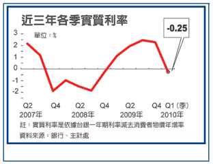 然而,根據主計處資料,第一季消費者物價年增率為1.28%,台灣銀行1年期定儲機動利率為1.03%,實質利率為-0.25%,是前年第四季以來,實質利率再度轉負。依照主計處的全年物價年增率預估值1.27%來看,央行若不升息,負利率將會持續到今年底。