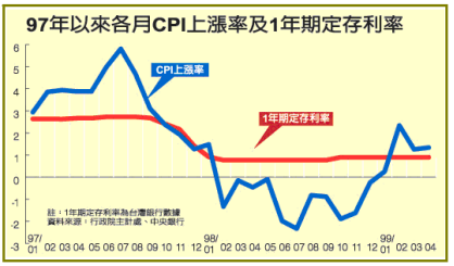 近日國內的物價情勢,就已顯露出這樣的苗頭。以本國最大銀行台灣銀行的1年期定存固定利率0.9%為例,就已從今年2月起,連續三個月低於CPI上漲率;即使以中央銀行目前的重貼現率1.25%來計算,也是連三月低於物價上漲率,顯示負利率已經現蹤。這也讓行政院主計處即將發布的5月物價情勢更受關注;如果上月CPI漲幅未見緩和,負利率的幅度擴大,代表中央銀行貨幣政策承受的壓力愈來愈大。