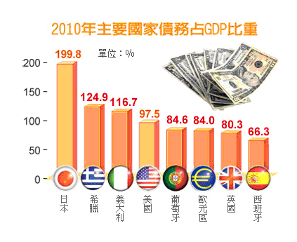 金融危機導致世界各國赤字暴增,2010年各國政府發債總額高達4.5兆美元,美國占45%,是全球最大發債國。經濟學人智庫(EIU)統計,美、日及歐元區等國,2010年政府債務逾35兆美元,預估2011年將逼近42兆美元。 註:美、日為OECD預估值。資料來源:OECD、歐盟執行會。 【2010/06/18 經濟日報】