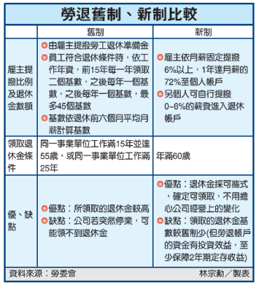 新制開辦後仍保留五年的彈性選擇空間,也就是原本仍採用舊制的勞工,或是五年前開辦時尚未選擇採用舊制或新制的勞工,必須在今(99)年6月底前決定是否採用新制。與原本的退休制度相比,新制的雇主提撥比率為6%,是舊制12%的一半,但是新制的帳戶將跟著勞工走,不會受到企業倒閉等因素干擾,導致無法支領退休金。