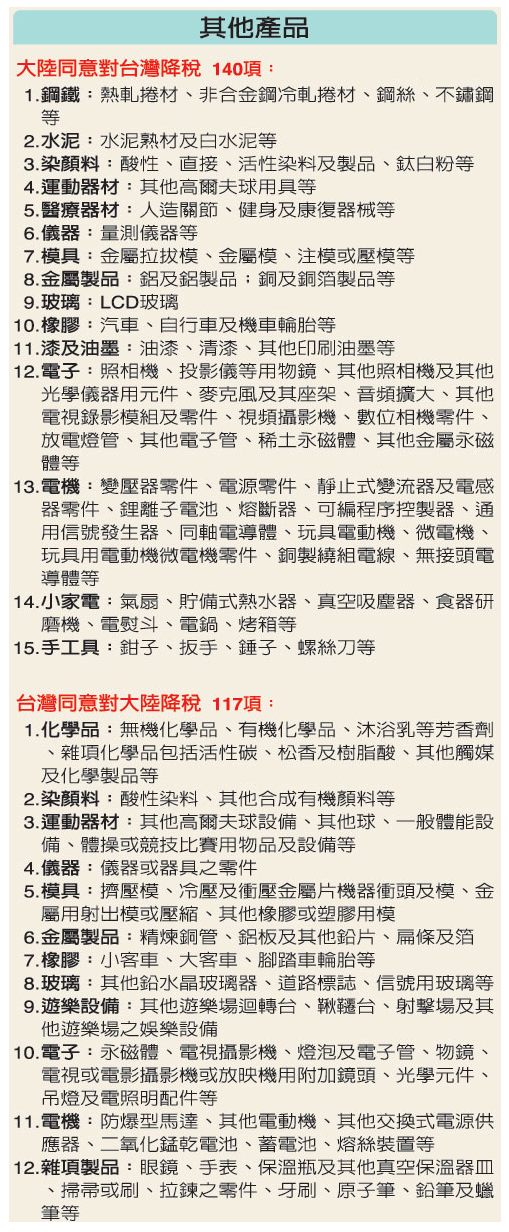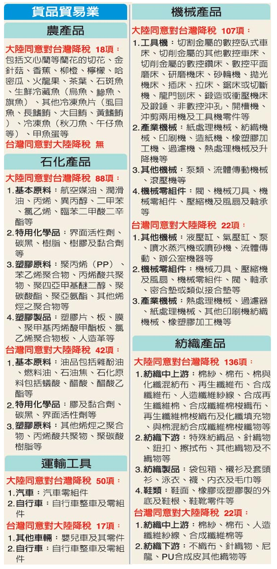 兩岸早期收穫清單明細/貨品貿易類 【聯合報╱本報訊】 【2010/06/25 聯合報】
