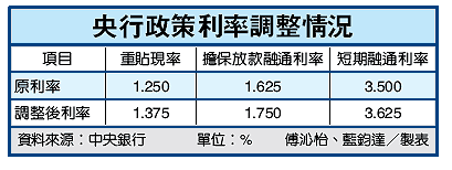 央行昨天舉行第二季理監事會,宣布因應國內景氣和物價情勢,即日起調高重貼現率、擔保放款融通利率和短期融通利率各0.125個百分點,調整後三項利率各為1.375%、1.75%和3.625%。