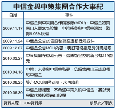 中信金去年11月中旬,與香港中策集團簽訂MOU(合作備忘錄),若中策成功投資南山人壽,中策將與中信金進行換股交易,中策拿出3成南山股權讓中信金認購,中策也將認購中信金9.95%股權。