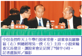 中信金昨天股東會焦點集中在南山人壽投資案和私募增資案,股東相繼發言,讓會議一路從上午9時開到下午4時19分,近七個半小時才結束,是中信金開過最久的一次股東會。