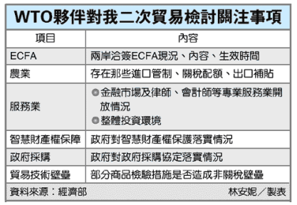 兩岸上周剛在重慶洽簽ECFA,本周正好輪到台灣在WTO接受每四年一次的TPR檢視。根據WTO秘書處早先蒐集的會員「熱門提問」,不少國家關注台灣的農業、服務業、政府採購開放情況,焦點指向ECFA的實施進程與內容。