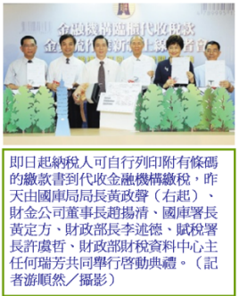 財政部長李述德表示,金融機構臨櫃代收稅款金資流作業,將使稅單全面進入條碼化,納稅人只要上網列印空白稅單,直接在網路上填寫繳稅資料,列印後即可持之向金融機構繳稅,稅額2萬元以下者,還可就近到據點眾多的超商繳交。