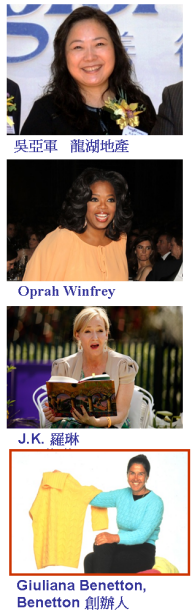 另外幾位白手起家的富豪包括奧普拉•溫弗瑞 (Oprah Winfrey)(56歲)和 J.K. 羅琳 (J.K.