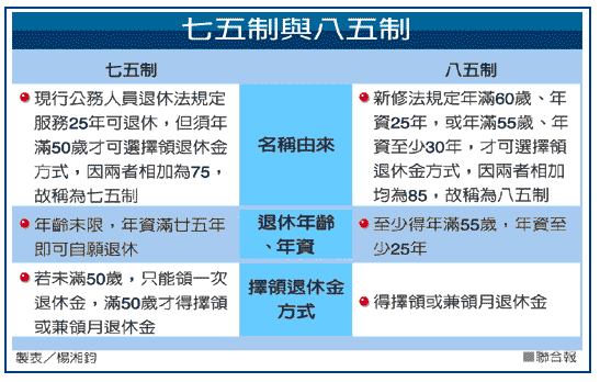依現行七五制,公務員任滿廿五年即可申請自願退休,若同時也年滿五十歲,即可擇領月退休金;改為八五制後,則須再加上年滿六十歲以上的條件,或是任職年資超過卅年以上、年滿五十五歲者,才可以自退休日起請領月退。新制將延後公務員退休年齡,可望解決目前「菁英搶退休」的人力反淘汰現象。