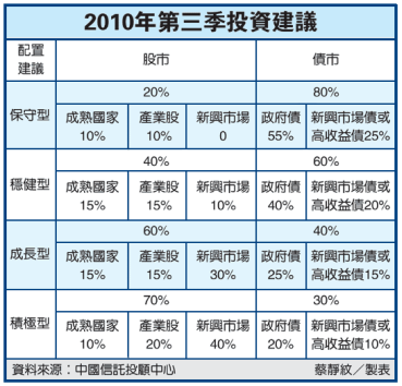 整體而言,中國信託投顧中心認為第三季應「減股加債」,減碼風險較高的新興市場股,繼續加碼高評等債券及政府債。對風險承受度較低的保守型投資人,債券或股票配置以成熟國家為主,可降低資產波動過大風險。