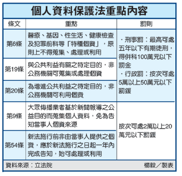 立法院日前三讀通過個資法,總統馬英九已公告,施行日期由行政院決定,目前擬於一年或一年半後施行。新版個資法對個資定義的範圍廣泛,並且擴大適用於所有行業別及個人,罰則也較舊法(電腦處理個人資料保護法)加重。