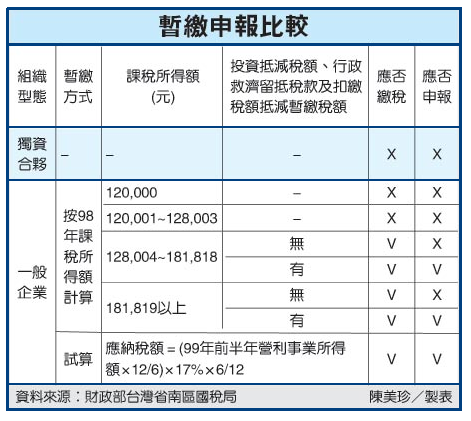 全台逾70萬家營利事業中,除獨資合夥事業可免申報並免繳納暫繳稅款外,一般非獨資合夥事業計算出的應納暫繳稅額如在新台幣2,000元以下者,也可以免辦理暫繳申報。