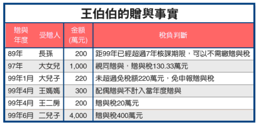王伯伯很少注意遺贈稅法規定,他曾在民國89年匯款200萬元給他的長孫,作為考上大學的獎學金。大女兒在97年購屋時,他也匯了1,000萬元到房屋賣方的帳戶。99年1月則匯款220萬給大兒子,給他周轉生意;當年4月還送了5克拉的鑽戒給王媽媽當生日禮物,價值300萬元;另外,也買了一支200