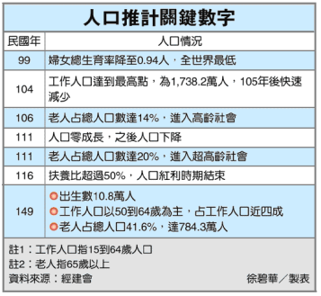 他說,老人社會提前來臨,未來台灣青壯人口平均撫養人口的負擔將更重。目前台灣每一百位工作年齡人口平均撫養卅六人,仍處於「人口紅利」時期;民國一二三年起,台灣將邁入撫養比超過百分之六十的「人口負債」時期,等於平均每兩位有生產力的青壯年人口,將撫養超過一位的小孩或老年人,負擔十分沉重。
