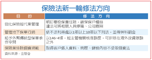 金管會將啟動新一輪保險法大修法,這次的目的是「社會公益」!保險法上回大修法是96年,今年初才公布修正107條的兒童保單部分,現在立法院還躺著139條的大股東審查修法,這次啟動的修法多達17條,內容包括管理地下保單、保險業排除個資法、外幣保單額度及強化保經代通路管理。
