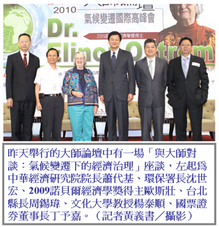 2009年諾貝爾經濟學獎得主歐斯壯(Elino Ostrom)昨(24)日表示,根據她的田野調查,節能減碳沒有萬靈丹,也沒有一體適用的辦法,尤其是共有財的使用,必須經過長期的資料蒐集與討論,才能制定相關的準則。但也惟有如此,才能解決複雜的共有財使用問題。由本報、中華經濟研究院、國票金控及工研院主辦的2010大師論壇「氣候變遷高峰會」昨天在台北舉行。歐斯壯並以「地下水資源治理」發表專題演講。
