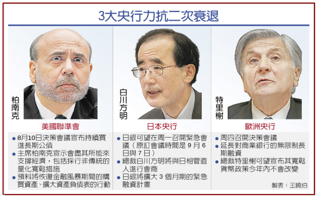 面對經濟復甦無力,陷入二次衰退的疑慮增大,美日歐三大央行都已準備出手挺經濟,最快在本周就會展開新一波的量化寬鬆行動,而預料美國聯準會將會恢復金融風暴期間購買資產,擴大資產負債表的行動,日本央行(日銀)
