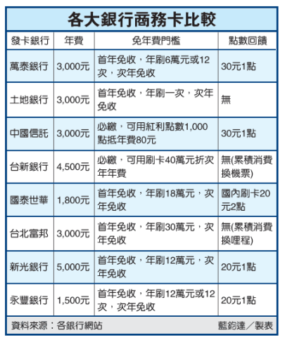 市面發行白金商務卡的銀行包括萬泰銀行,中國信託、台新銀行等,各銀行免年費門檻也不同。以萬泰銀為例,首年免收,若年刷6萬元或12次,次年可免收年費,是市場條件較優惠的銀行。