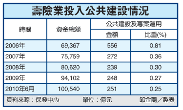 保發中心統計,今年6月底全體壽險業資金規模已達10兆元,投入公共建設及專案運用的金額只有251億元,占全體資金運用比率僅0.25%。保險業者說,除了放寬投資單一案件的股權、債權比重,保險業者也希望出資投資的保險業可指派董監事,參與並監督公共建設案件經營。
