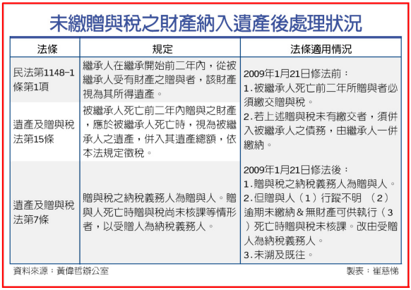 但這項規定並未溯及既往,因此對於修法前的案件,被繼承人死亡前2年所贈與者,若未繳交贈與稅則須併入被繼承人的債務,須由繼承人一併繳納。