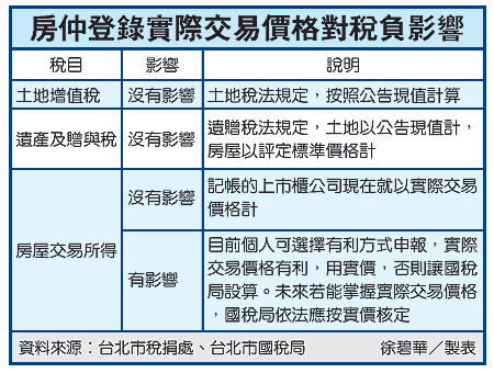 行政院院會今(9)日將通過不動產經紀業管理條例修正草案,強制房仲業者登錄實際的不動產成交價格。實價揭露後,個人房屋交易所得稅負可能也要跟著大幅提高,台北市國稅局官員指出,若能掌握實際價格,當然按實價核定。